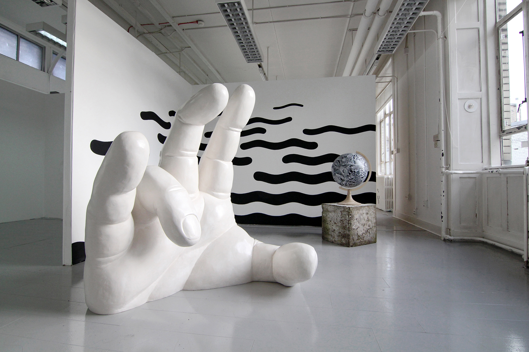 The Hand is pointing toward the last sun rays on a summer solstice evening. The Moon Globe is collaged from the printed images of James Nasmyth´s and James Carpenter´s moon studies from the 19th century all surrounded by black waves painted on the walls. This installation looks into the eye of a contemporary world and the challenges it is facing. The title is borrowed from Black Sabbath´s song National Acrobat.